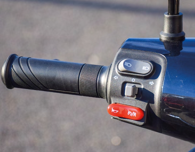 Pour enclencher la marche, il suffit de maintenir les deux leviers de frein et d’appuyer sur le bouton dédié. Une procédure simple, rapidement intuitive, même pour un conducteur débutant.