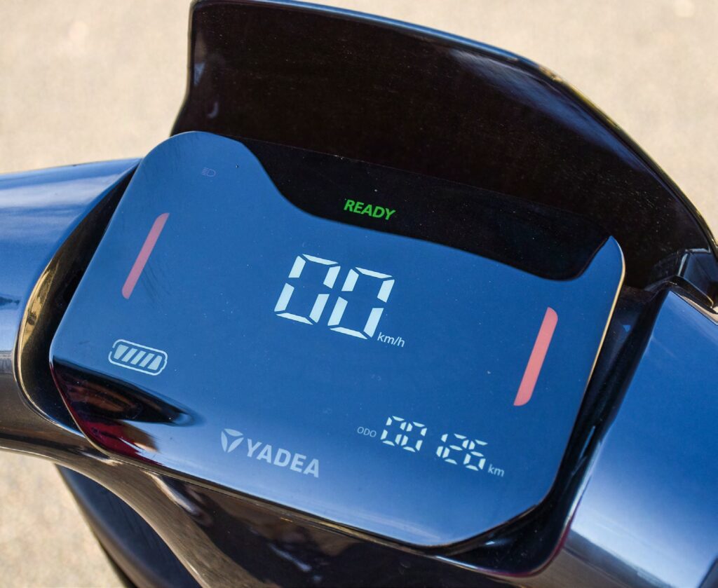 Bonne surprise également, la présence d’une alarme de série, capable de bloquer la roue arrière, ainsi qu’un système de géolocalisation accessible via l’application Yadea. Le tableau de bord numérique, lisible et bien fini, complète l’ensemble.