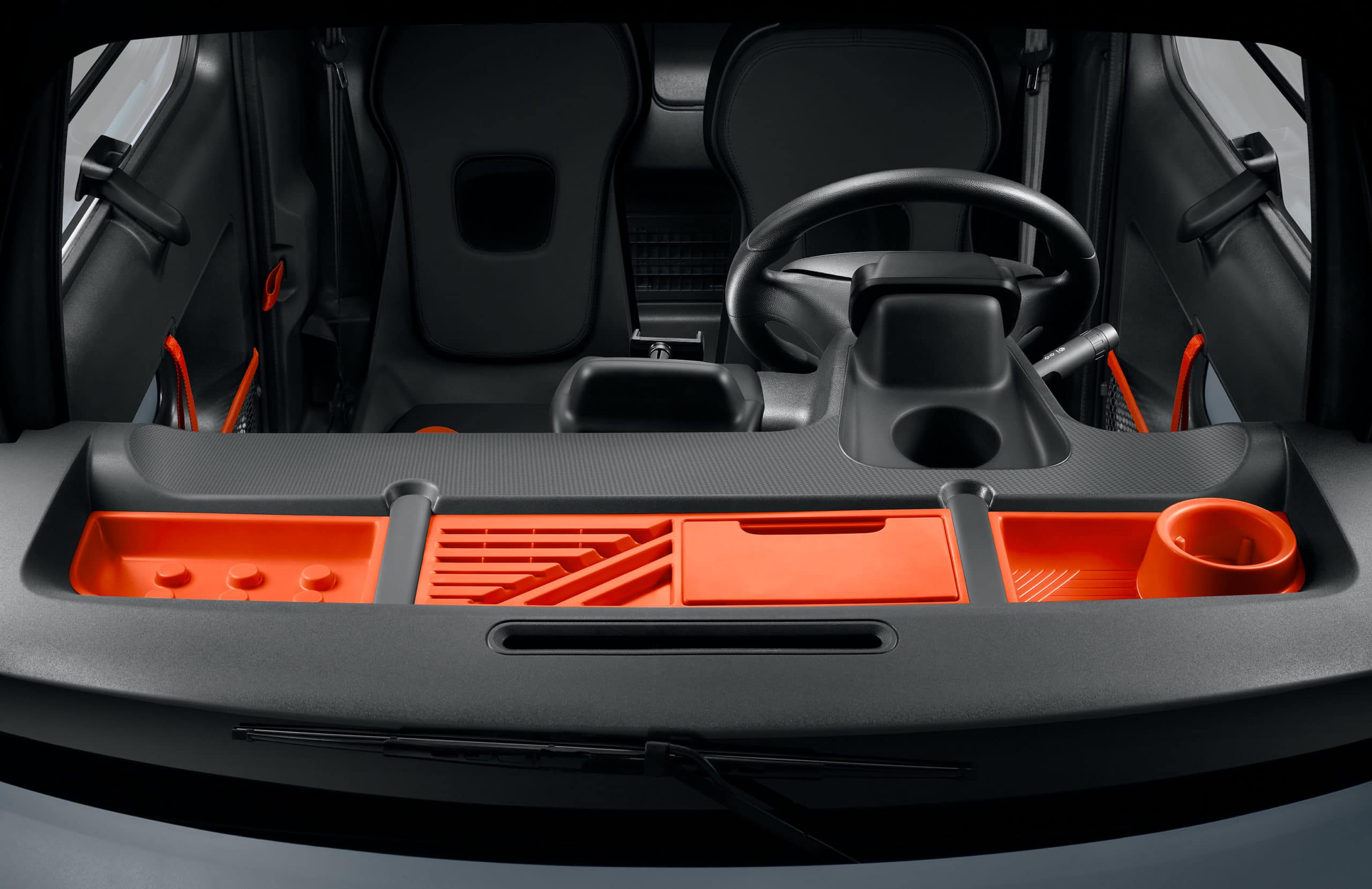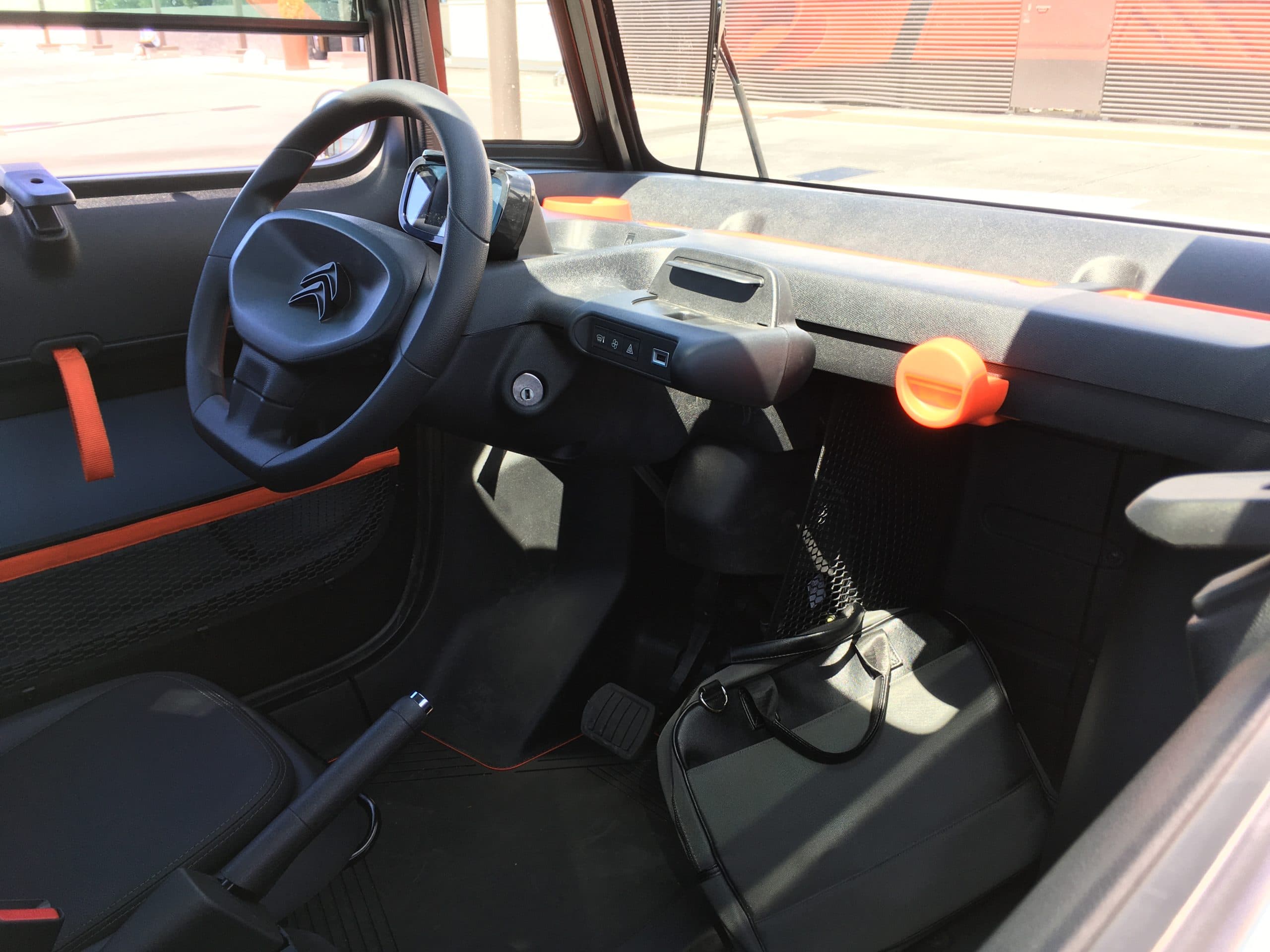Si la Citroën Ami est identifiable comme une voiture sans permis, elle va à contrepied de la tendance de ce marché. Car là où tous les constructeurs, sous la pression de la clientèle, proposent des modèles ressemblant le plus possible à de vraies voitures, en utilisant au maximum les possibilités offertes par la réglementation en termes de dimensions (3 mètres de long, 1,5 m de large), Citroën a choisi un look singulier et une taille menue. Bien plus petite qu’une Smart Fortwo, l’Ami s’étend sur seulement 2,41 m alors que la largeur ne dépasse pas 1,39 m. Et alors que la plupart des Aixam, Ligier et autre Chatenet rivalisent pour offrir de grands coffres (un argument de poids pour la clientèle de ce genre de véhicules), Citroën a fait le choix radical… De ne pas offrir de soute ! Seule une niche, au pieds des passagers avant, permet de loger une valise cabine.