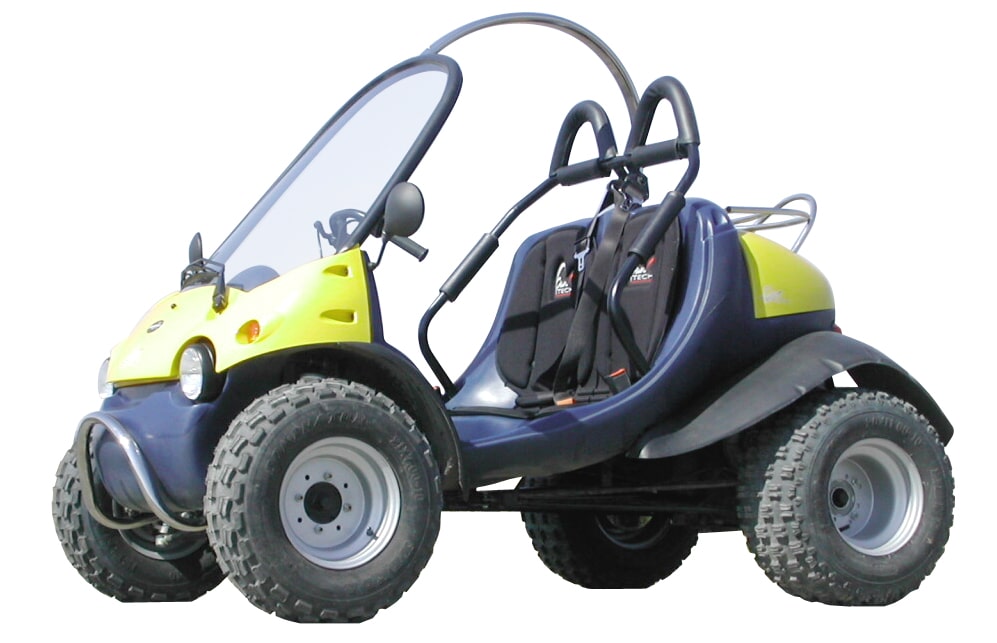 Très léger (240 kg), il dispose comme le veut la tradition maison d’un châssis en polyéthylène rotomoulé et de panneaux de carrosserie en ABS thermoformé. Il se conduit grâce à un guidon, comme un quad. De plus, il dispose de gros pneus à crampons qui lui permettent de naviguer sur des terrains boueux. Homologué en catégorie quadricycle lourd, il fait appel à un monocylindre essence Lombardini de 340 cm3, placé à l’arrière et associé à un variateur. A bord, l’équipement est tout aussi minimaliste que le tarif. Idéal en bord de mer, le Fun Quad est donc assez goûté pour la location aux touristes, qui peuvent ainsi sillonner le littoral cheveux au vent.