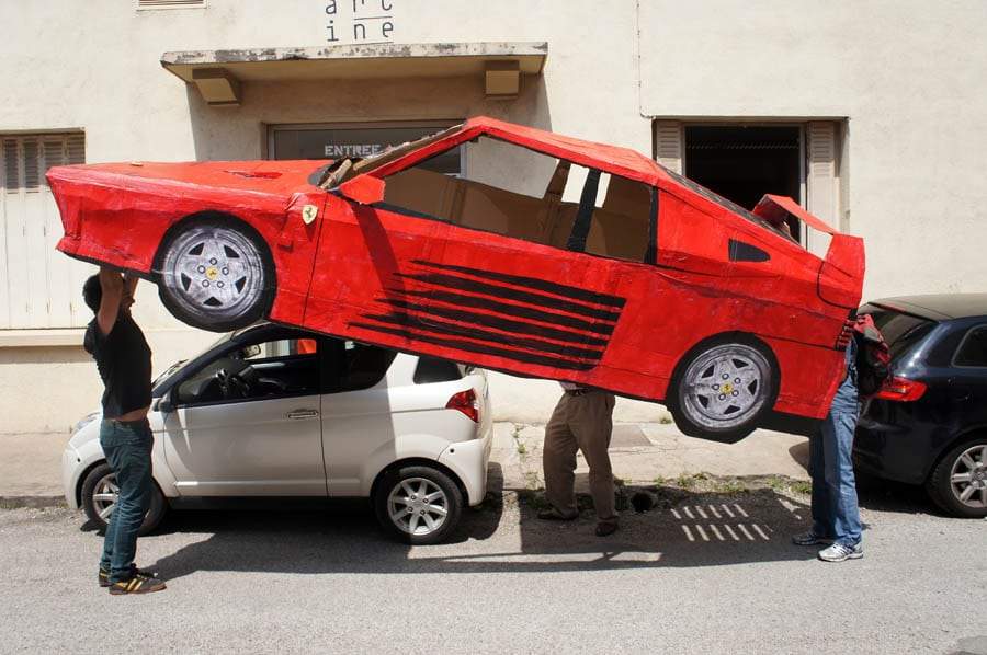 Tu nais, tuning, tu meurs… Derrière cet énoncé lapidaire se cache le titre d’une exposition programmée du 12 mars au 15 juin à la biennale du design de Saint Etienne. Celle-ci aura pour ambition de questionner le rapport au beau et au bon goût, en fonction des classes sociales, partant du principe que les institutions culturelles et artistiques ne se sont jamais approprié le phénomène du tuning. Parmi les œuvres présentées, on trouve Cardbord Ferrari de Benedetto Bufalino. Habitué à travailler le medium automobile, l’artiste français a recouvert une voiture sans permis (en l’occurrence une Aixam Crossline) d’une carrosserie en carton en forme de Ferrari Testarossa, avant de rouler ainsi dans les rues de Lyon. Un moyen de souligner le décalage entre le rêve et la réalité automobile.